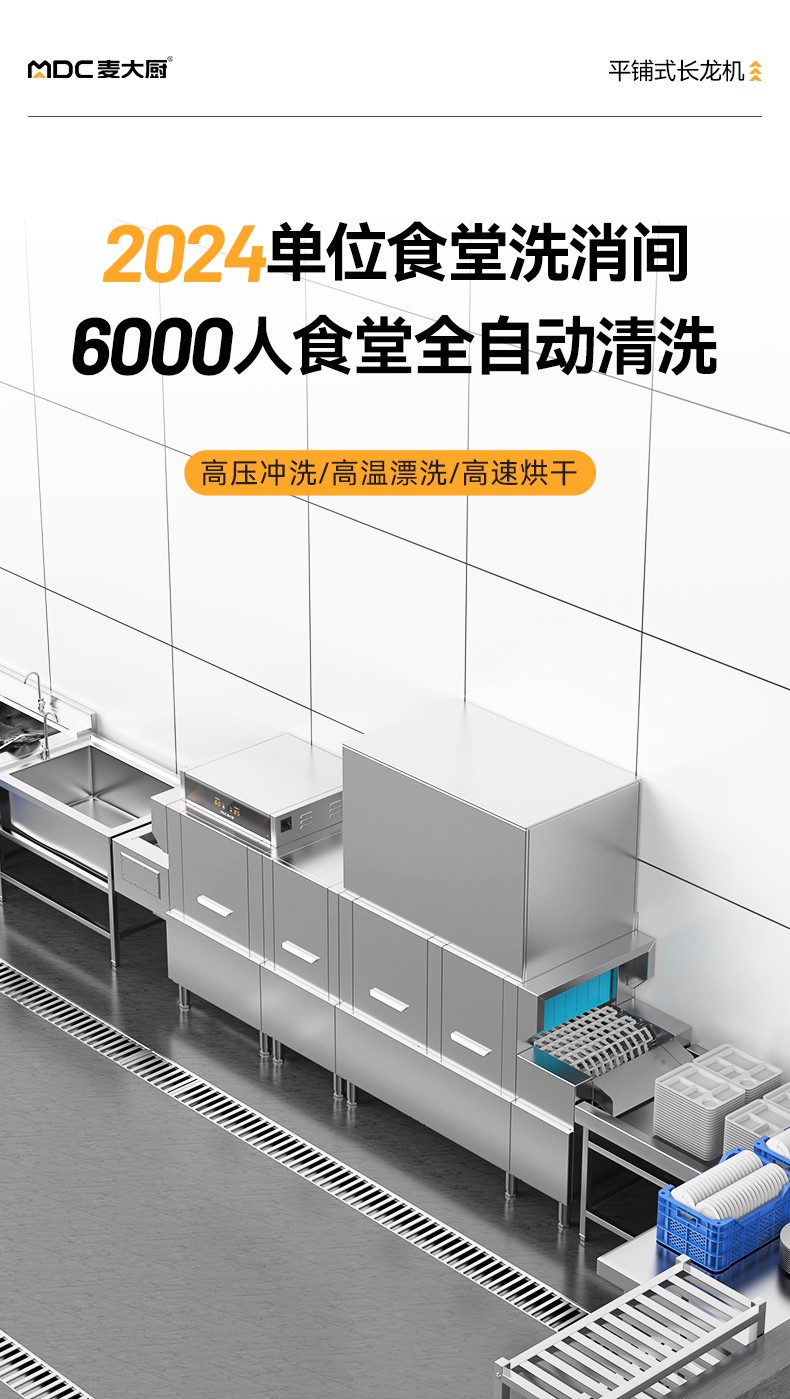 麦大厨3.6m豪华款平放式单缸双喷淋单烘干单位食堂洗碗机