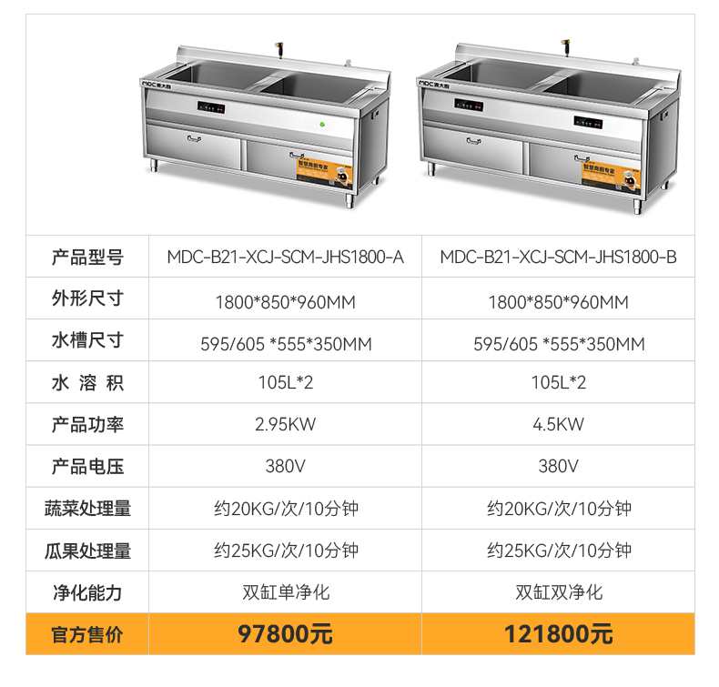 麦大厨1.8米自动商用洗菜机果蔬清洗机双缸水触媒净化机