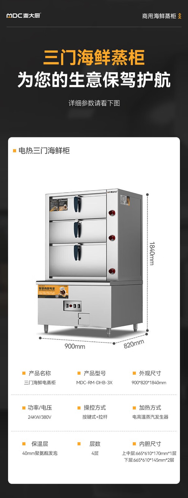 麦大厨商用蒸柜900mm电热款三门海鲜蒸柜